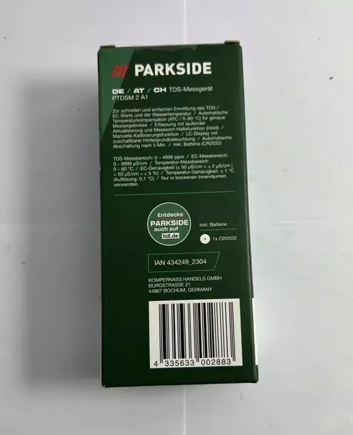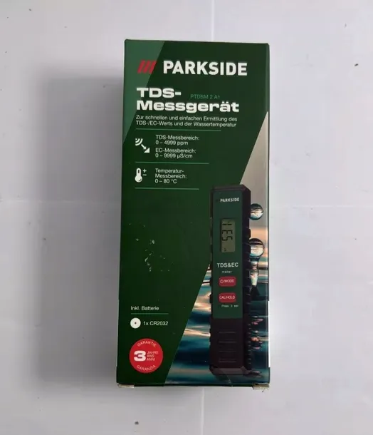 Miernik TDS/EC Parkside PTDSM 3 A1, służący do badania jakości wody. Zastosowanie: Szybki pomiar poziomu TDS (suma rozpuszczonych substancji stałych), EC (przewodność elektryczna) oraz temperatury wody. Zakresy pomiarowe: TDS: 0-4999 ppm; EC: 0-9999 µS/cm; Temperatura: 0-80 °C. Funkcje: Automatyczna kompensacja temperatury (ATC) oraz funkcja zatrzymania wyniku pomiaru (Hold). Zasilanie: Bateria w zestawie.